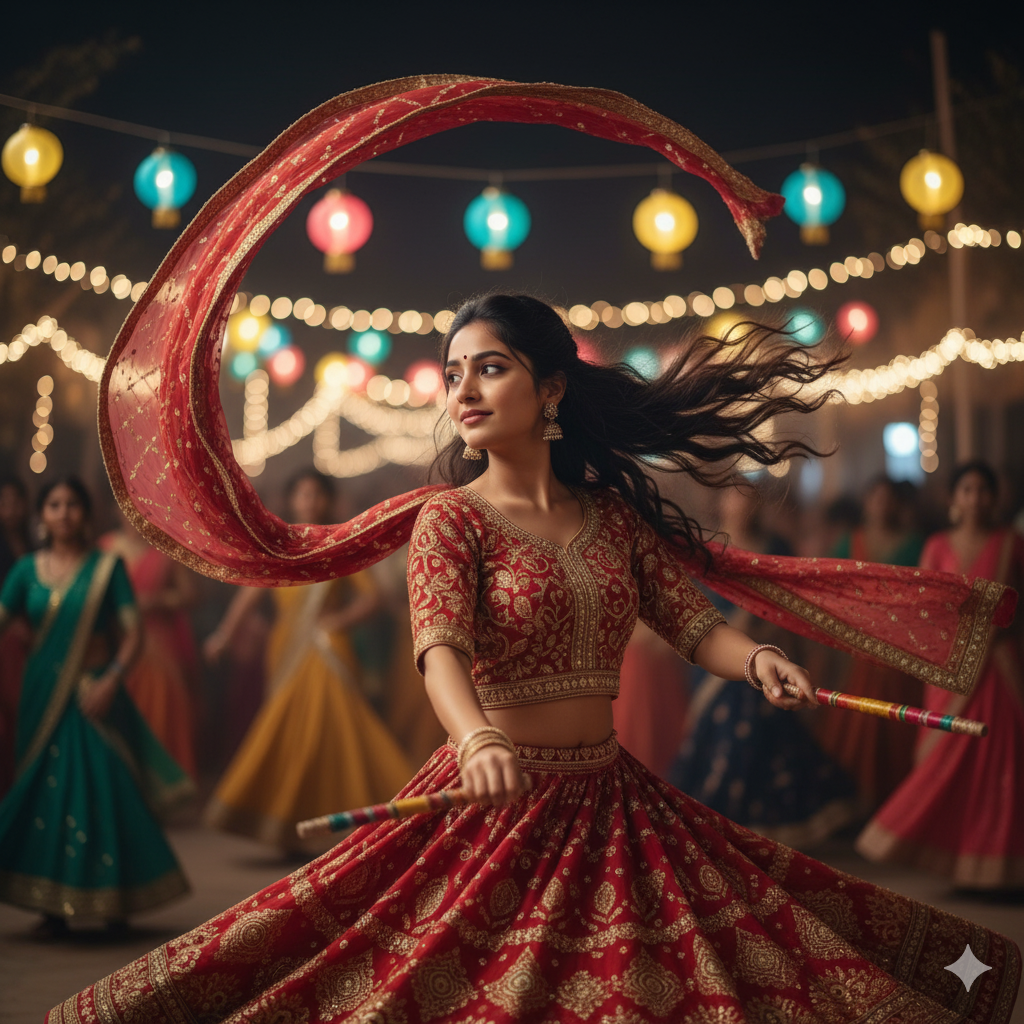 4k cinematic portrait of a young Indian woman in a red and gold lehenga choli, twirling gracefully mid-dance during Navratri dandiya night. Her dupatta flies dramatically in the air, her long wavy hair flows with the movement. She holds colorful dandiya sticks, surrounded by other blurred dancers in colorful ghagras. The background glows with warm fairy lights and hanging lanterns, full of energy, joy, and motion. Soft bokeh lighting, festive night vibe, elegant traditional dance moment."Creative users also generate Dasara prompts with modern styles. Fashion edits mix trendy outfits with traditional accessories. Neon lighting and digital effects give a fusion look. These edits appeal to younger audiences. It keeps the festival celebrations fresh and stylish.