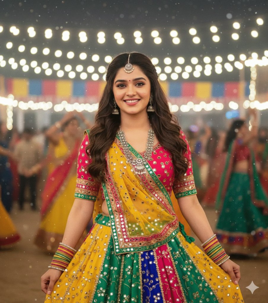 "High-quality portrait of a young Indian woman smiling gracefully while wearing a colorful traditional Navratri chaniya choli — yellow, green, pink with mirror work embroidery and silver jewelry. She stands amidst a crowd of blurred dancers under a canopy of fairy lights and festive decorations. Soft bokeh background, vibrant colors, joyful expression, traditional garba night atmosphere, cinematic lighting, full-frame focus on face and outfit."