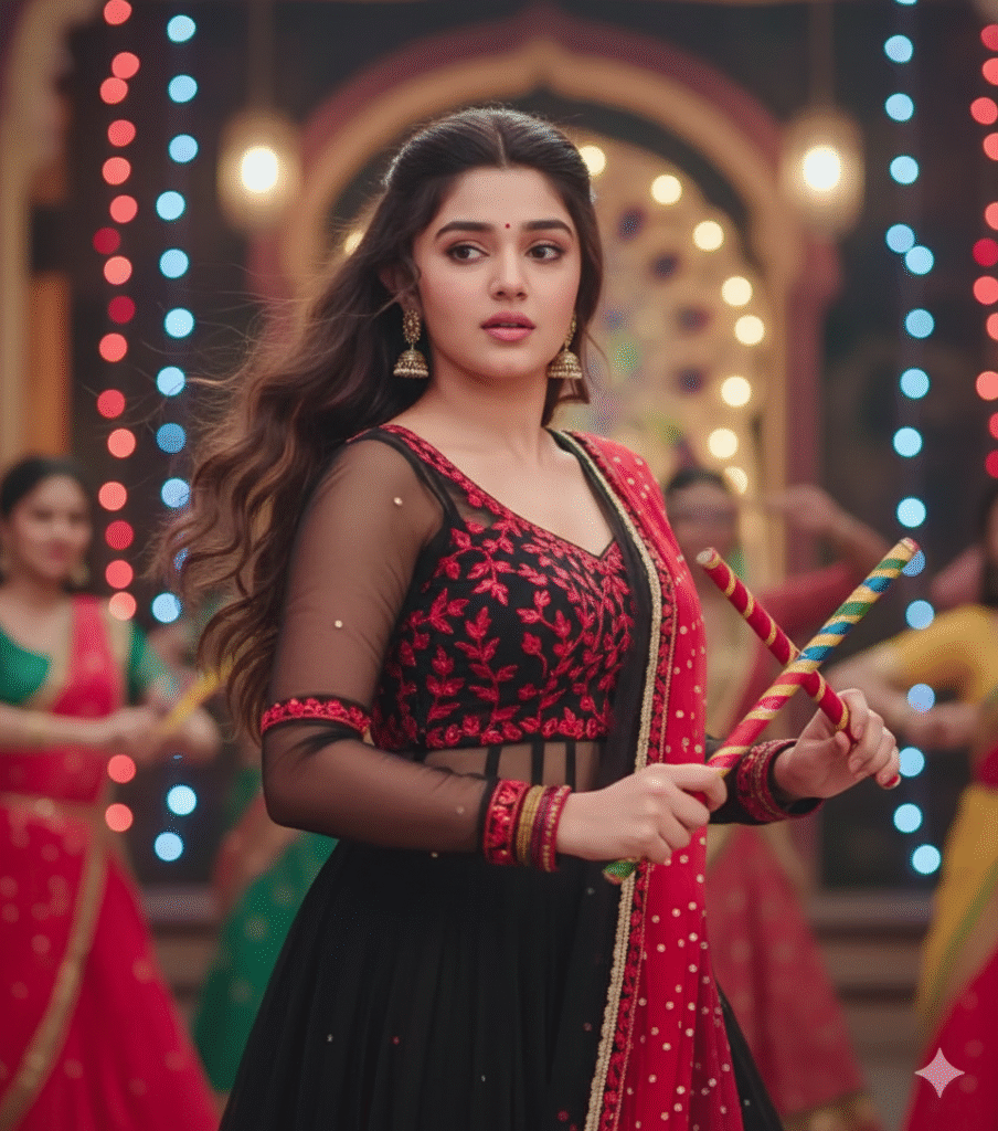 "4k realistic portrait of a young Indian woman with long wavy hair, wearing a black and red embroidered lehenga choli with a sheer black sleeve blouse and red dupatta. She is holding colorful dandiya sticks in both hands, mid-dance during Navratri. Soft festive lights and blurred dancers in traditional outfits glow in the background, creating a cinematic atmosphere with colorful bokeh and fairy lights. Elegant yet energetic expression, traditional jewelry, perfect lighting, high detail, full festive vibe."Family portraits are also going viral with AI prompts. Multi-generation edits show grandparents, parents, and children together. The colorful atmosphere highlights togetherness. This trend is perfect for spreading festive spirit online. Families use them for greetings and festival wishes.