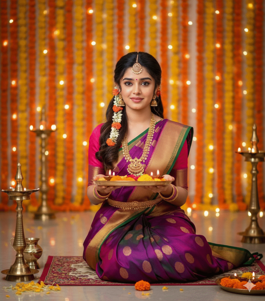 "Ultra-realistic portrait of a young Indian woman sitting gracefully on the floor in a traditional South Indian silk saree — purple with gold border and pink blouse. She holds a decorated brass plate with lit diyas and marigold flowers. Background is decorated with vertical marigold and jasmine garlands, glowing fairy lights, and brass lamps. She wears temple jewelry, gajra in hair, and a calm, devotional expression. Festive lighting, high detail, warm tones, traditional Indian celebration atmosphere."