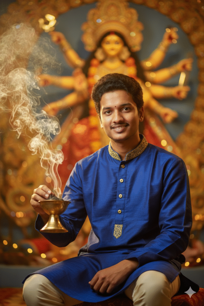 Ultra-realistic portrait of a young Indian man seated gracefully in front of a Durga Maa idol, wearing a deep blue silk kurta with golden detailing. He holds a brass aarti lamp emitting fragrant smoke, which softly curls through the warm festive light. Background features a beautifully decorated idol with glowing diyas and marigold garlands. Cinematic composition, warm tones, devotional Durga Puja setting, detailed smoke effect, calm and spiritual mood."