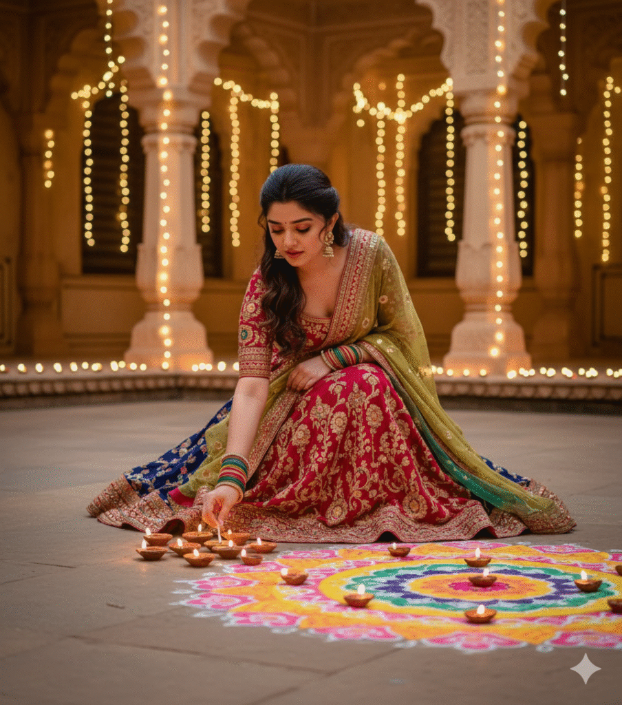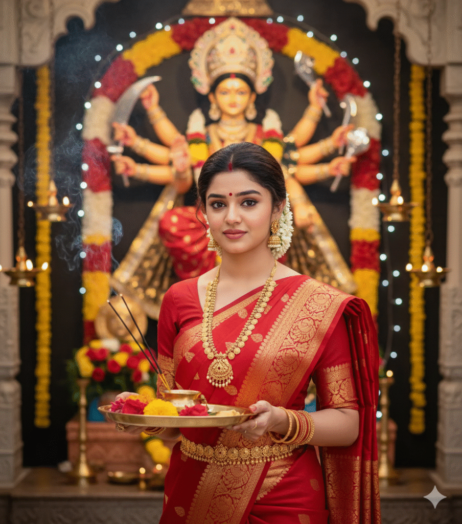 "4k devotional portrait of a young Indian woman standing before a decorated Durga Maa idol during Navratri. She wears a rich red silk saree with golden zari border, traditional temple jewelry, and flowers in her hair. She holds a brass pooja thali with diyas, kumkum, and flowers. The background features the Durga idol, glowing lamps, marigold garlands, and incense smoke, creating a serene and divine festive atmosphere. Soft lighting, realistic details, calm expression.""Ultra-detailed cinematic portrait of a young Indian woman dressed in a red embroidered lehenga with green dupatta, lighting diyas on a beautiful rangoli design during Diwali night. She sits gracefully in a courtyard decorated with strings of warm fairy lights and traditional arches in the background. She wears colorful bangles, earrings, and subtle festive makeup. The atmosphere is warm, golden, and serene, filled with devotion and elegance. Perfect lighting, detailed attire, festive ambiance."