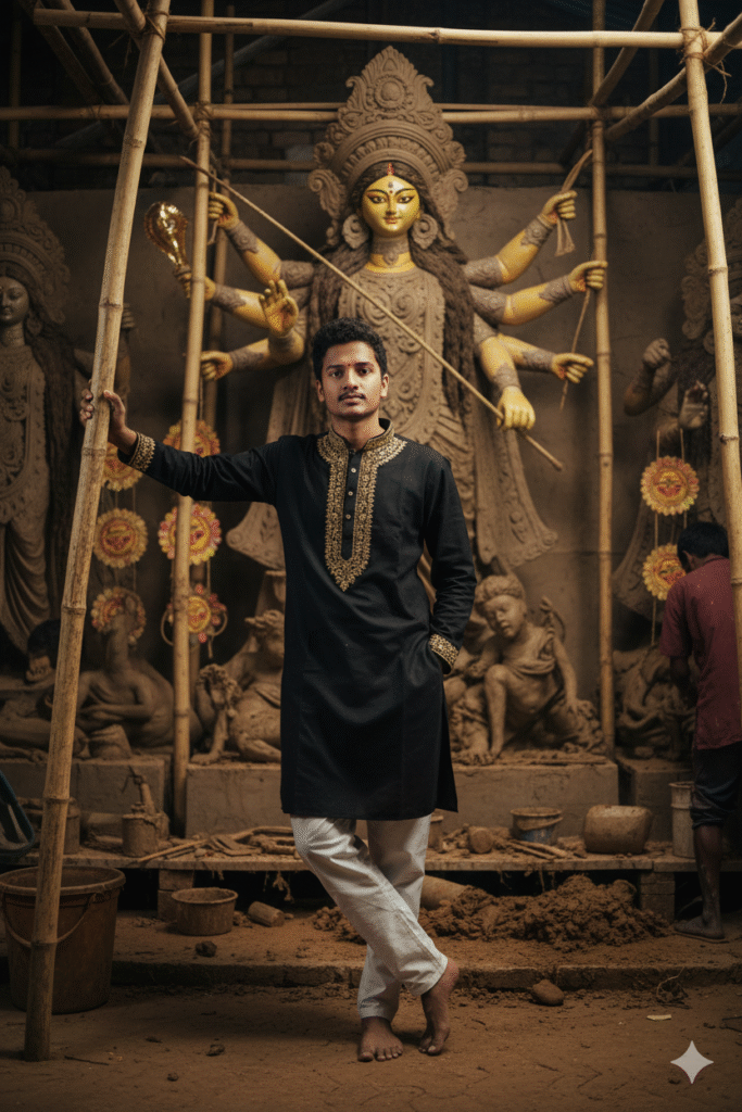 4k realistic full-body portrait of a young Indian man wearing a black kurta with golden embroidery and white churidar, standing barefoot in a clay idol workshop. Behind him, artisans sculpt the Durga Maa idol surrounded by bamboo scaffolding and clay figures. Warm ambient lighting, earthy textures, authentic traditional setting, artistic and cultural atmosphere, documentary-style Durga Puja preparation scene, natural pose, detailed craftsmanship."