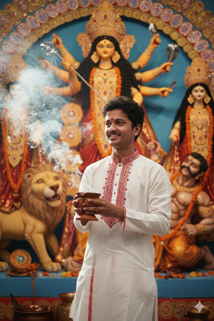 4k cinematic portrait of a young Indian man wearing a white kurta with red embroidery, performing aarti during Durga Puja. He holds a clay incense holder with fragrant smoke rising gracefully. Behind him stands a beautifully adorned Durga Maa idol with lion and other deities, surrounded by glowing diyas, garlands, and festive lights. Bright warm tones, devotional expression, soft bokeh lighting, high detail, serene festive atmosphere."Some prompts highlight Goddess Durga in artistic AI forms. Images show powerful poses, divine ornaments, and glowing backgrounds. These edits carry strong spiritual vibes. Many people use them for devotional posts during the festival. The combination of art and divinity attracts high engagement.
