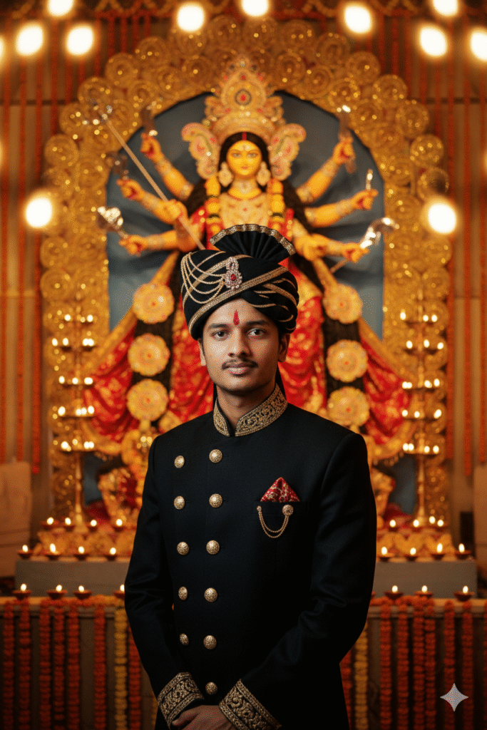 4k cinematic portrait of a young Indian man standing confidently in front of a Durga Maa idol, wearing an elegant black sherwani with golden embroidery and a matching royal turban. His outfit features ornate buttons and a red pocket square. The backdrop is richly decorated with lights, marigold garlands, and diyas, reflecting the grandeur of Durga Puja celebrations. Soft golden lighting, sharp focus, festive yet regal atmosphere, traditional Indian fashion photography."