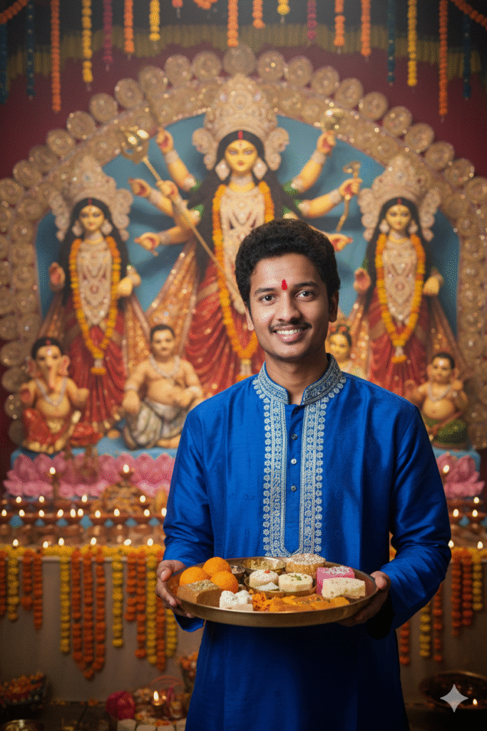 "4k realistic portrait of a young Indian man wearing a royal blue kurta with silver embroidery, smiling warmly while holding a brass plate filled with Indian sweets and prasad. He stands before a grand Durga Maa idol adorned with vibrant red saree, golden crown, and garlands. The background glows with rows of diyas, marigold garlands, and festive decorations. Warm lighting, soft bokeh, traditional Durga Puja atmosphere, detailed attire, serene devotional vibe."