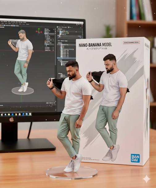 Create a 1/7 scale commercialized figurine of the characters in the picture, in a realistic style, in a real environment. The figurine is placed on a computer desk. The figurine has a round transparent acrylic base, with no text on the base. The content on the computer screen is a 3D modeling process of this figurine. Next to the computer screen is a toy packaging box, designed in a style reminiscent of high-quality collectible figures, printed with original artwork. The packaging features two-dimensional flat illustrations.”Even brands and businesses have started adopting this style in their campaigns. It works well for technology products, fashion items, and creative projects because it gives everything a stylish and forward-thinking vibe without losing its human touch. The mix of old and new shows versatility, which helps brands appear both reliable and innovative at the same time.