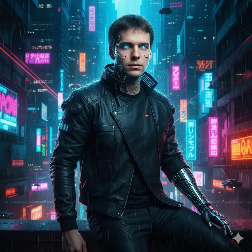 Create a futuristic, cyberpunk-themed portrait. The subject should have subtle cybernetic enhancements and be set against a backdrop of a neon-drenched, technologically advanced cityscape. The subject should be facing the camera with right clothes and pose.